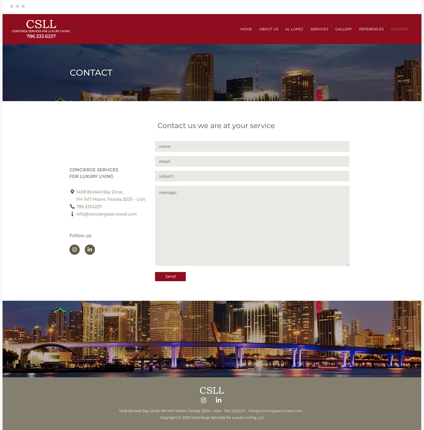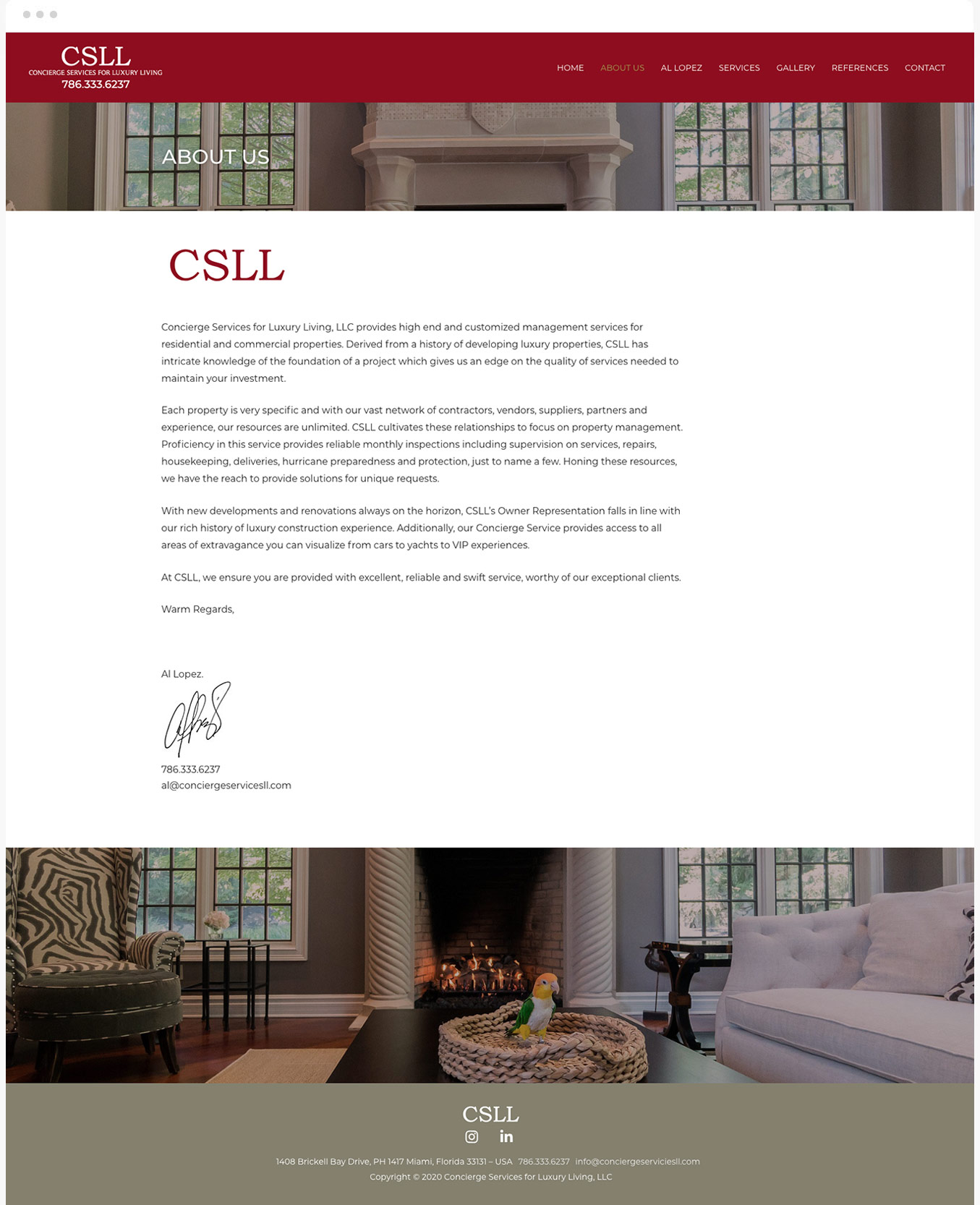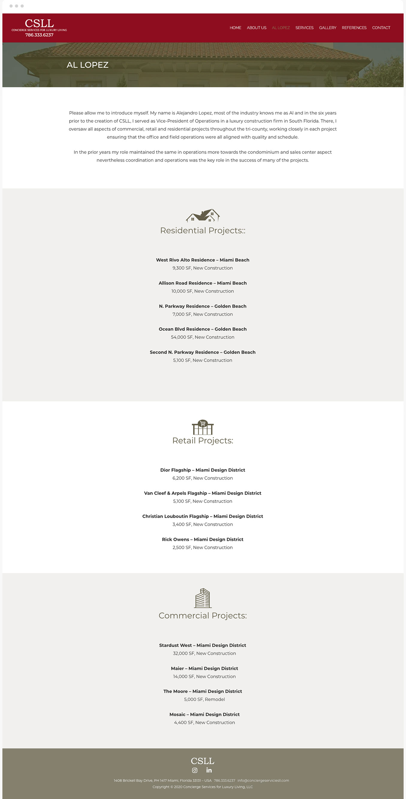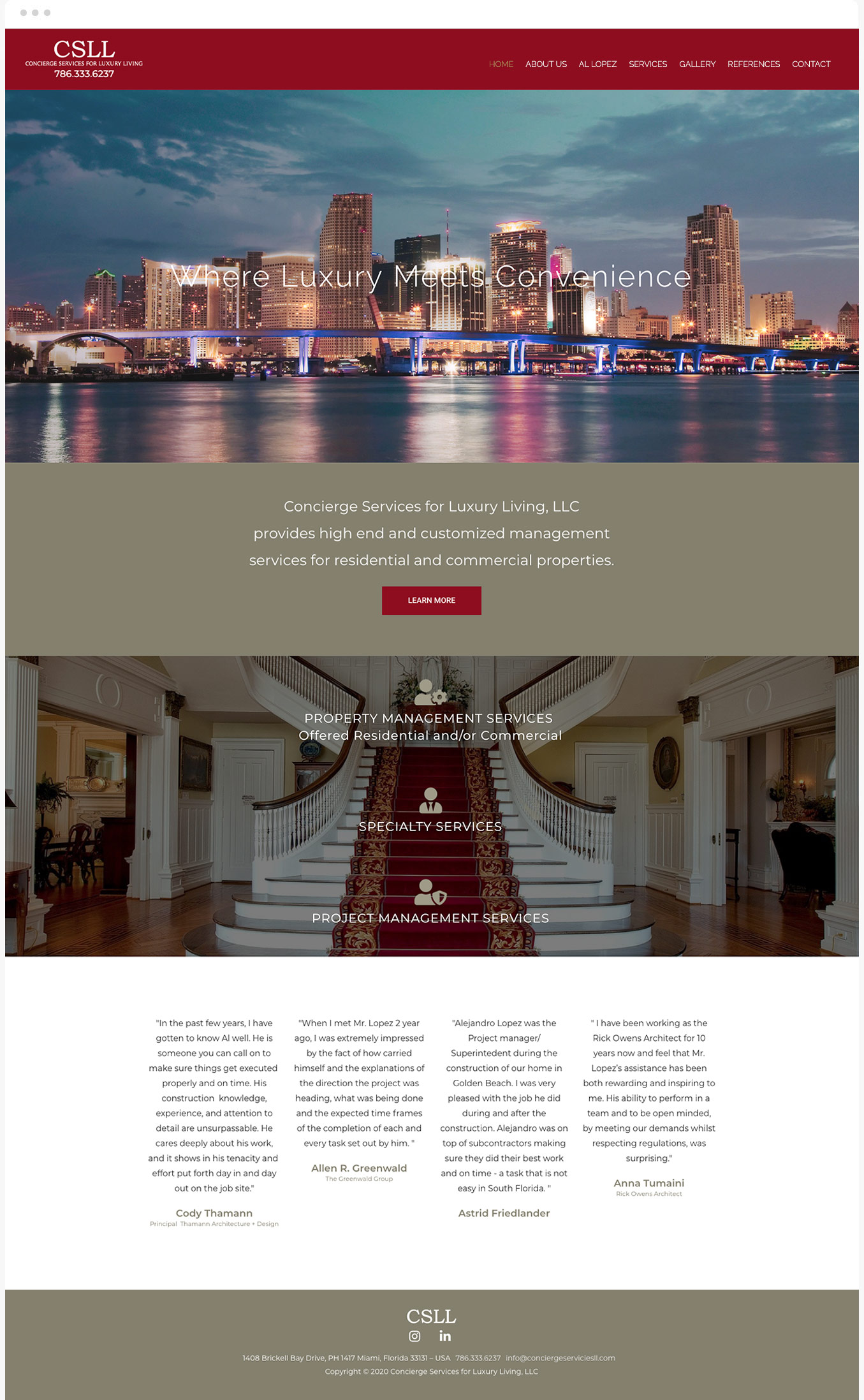 Concierge Services for Luxury Living brinda servicios de administración personalizados y de alto nivel para propiedades residenciales y comerciales, se especializan en el mantenimiento de bienes muebles e inmuebles en el área de Miami para clientes que permanecen largos períodos de tiempo ausentes de sus propiedades, el proyecto consistió en el diseño de su sitio web, para lograr una atmósfera de elegancia y exclusividad combinamos un tono dorado con el color rojo escarlata de la marca.